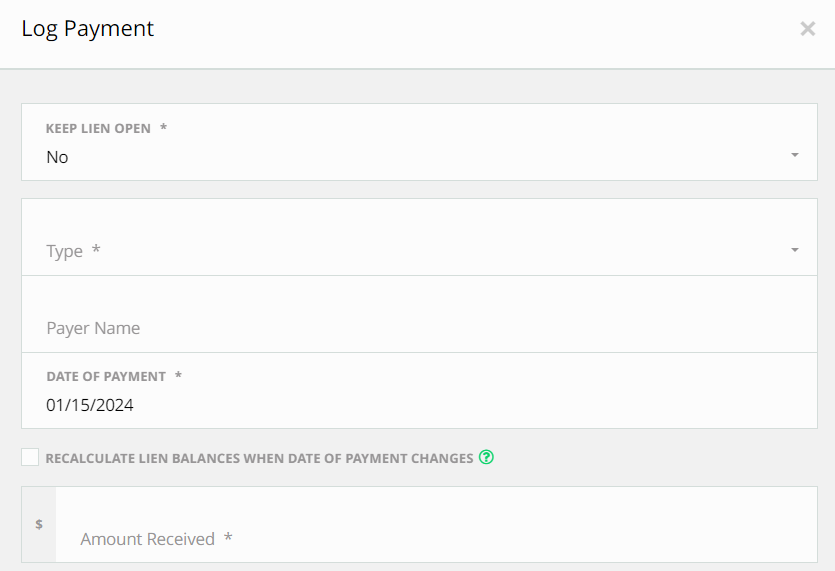 Through this window, the user can also choose if the lien will stay open after logging the payment or not. Clicking the Recalculate checkbox will also help automatically recalculate the remaining lien balance if the date of payment is different from what's specified for the lien.