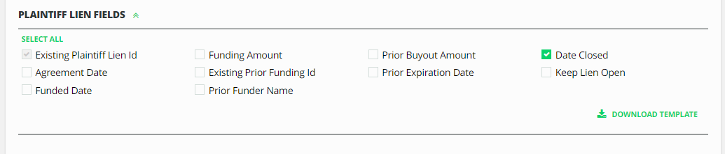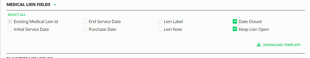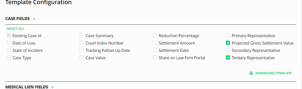 - Click "Download Template" to create a CSV file with these chosen columns. You can select more than one field at a time. So if you want to change both your DOB and law firm for the client, you can choose both. However, lien fields and case fields cannot be edited on the same template. You must use separate CSV files.