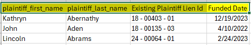 In the downloaded template file, you may want to add the corresponding first and last name of the plaintiff for your reference to ensure you are adding the correct case, and then remove them prior to import. Once done, fill in the next column with either the Lien or Case ID. The short version is what’s needed for the Bulk Edit tool. Here’s an example if you wish to update the Funding Date for three of your existing liens in the software: