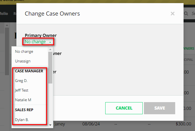 - Click on the dropdown to choose from the list of name of the case owner you want to assign. You can select up to three case owners.