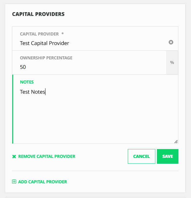 A Funder Software user can add Capital Funding information in the software as well. This includes the name of the Capital Provider, the Percentage of ownership and Notes.