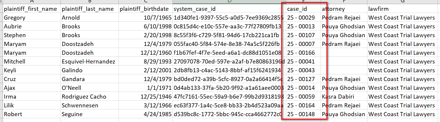 - In the exported file, locate the Case ID column. For this import, the shortened Case ID is what’s needed.