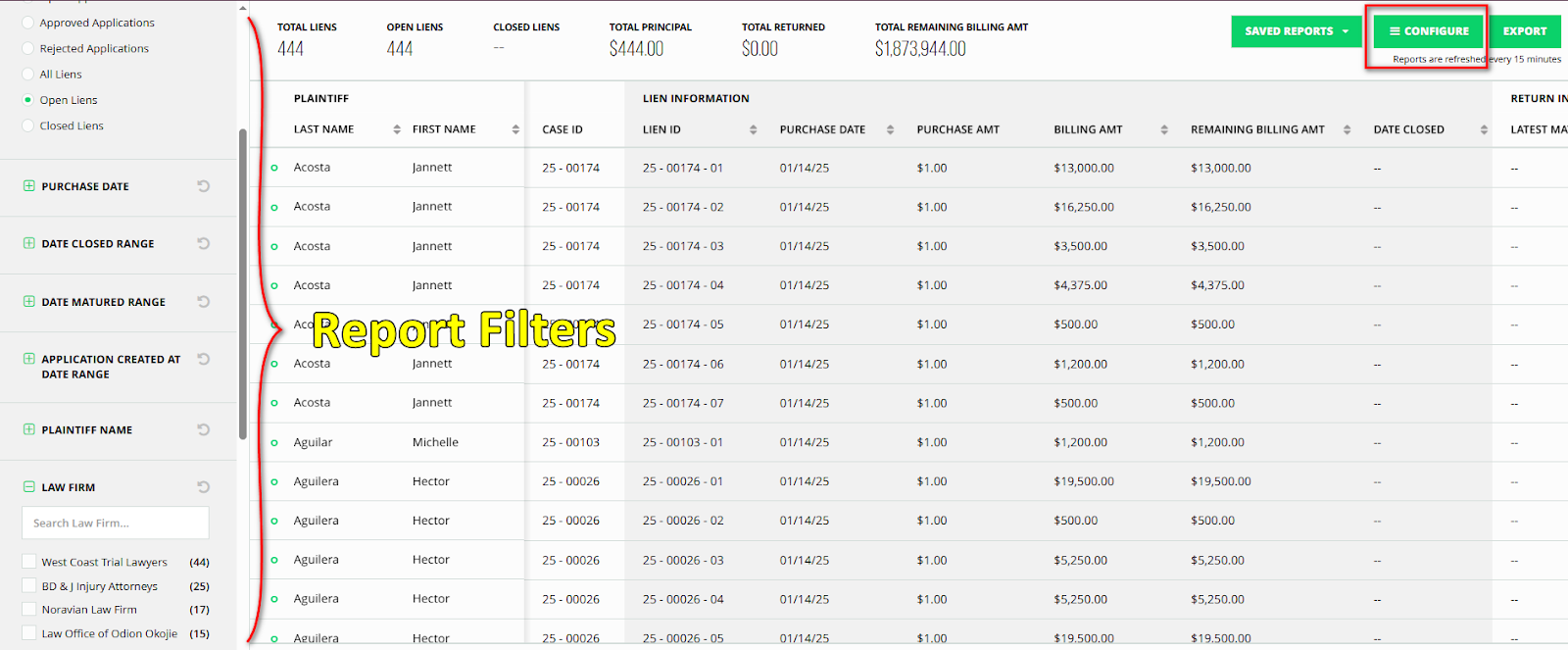 Use the filters on the left side. There are a number of filters you can use such as by Law Firm, by State of Incident, or by Medical Facility, to name a few. You can also configure the report and remove the columns you won’t be needing to generate your report faster.