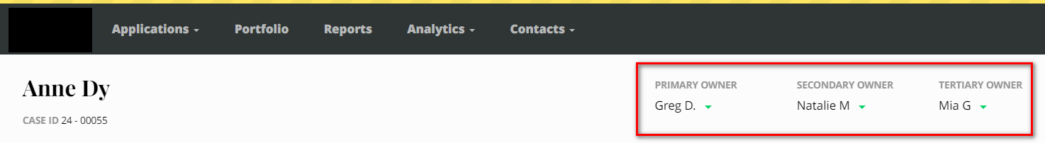 - At the top of the case, there are fields to enter Primary, Secondary and Tertiary Owners. The person who created the case file will automatically become the Primary Owner but can be changed by clicking on the field and selecting from other users within the organization.